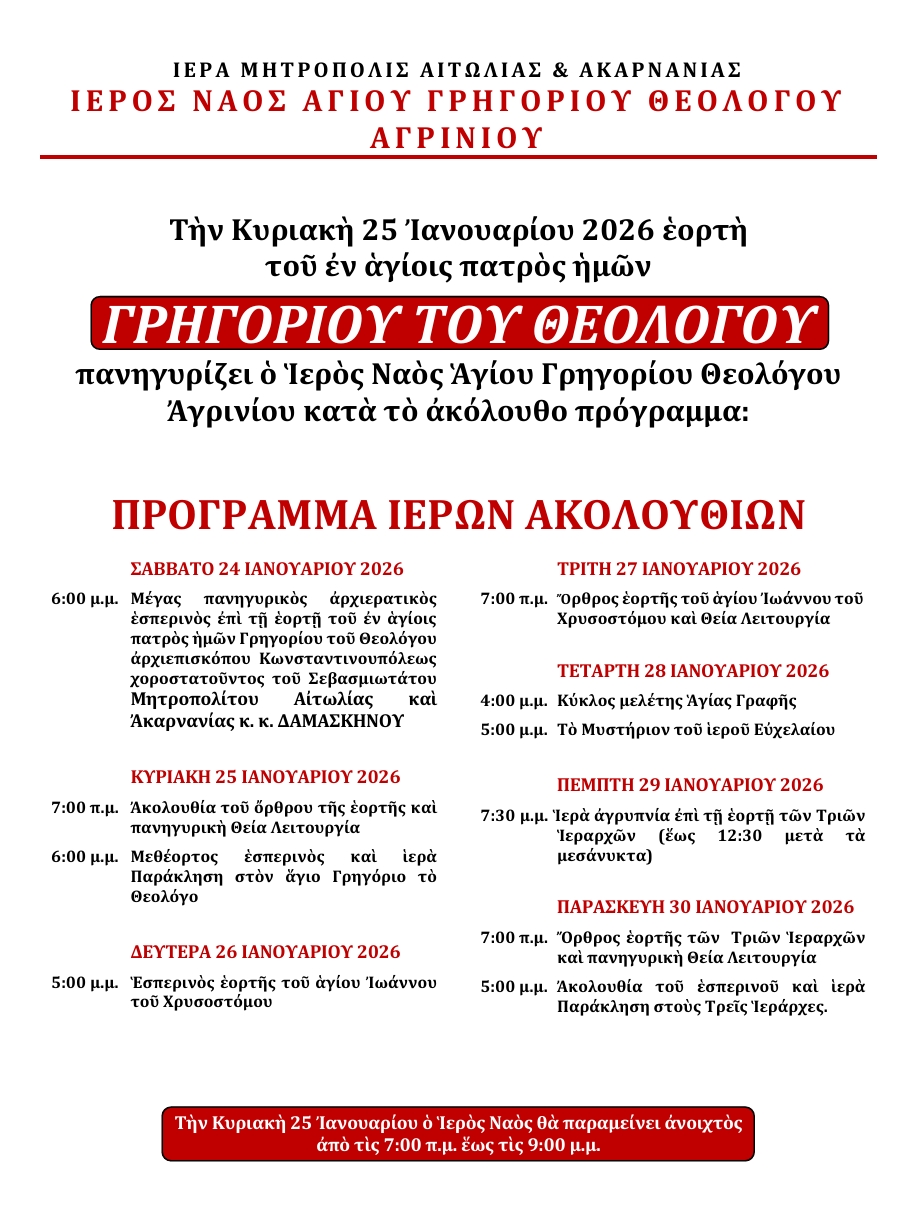 Την Κυριακή 25 Ιανουαρίου 2026 εορτή του εν αγίοις πατρός ημών Γρηγορίου αρχιεπισκόπου Κωνσταντινουπόλεως του Θεολόγου πανηγυρίζει ο ομώνυμος Ιερός Ναός στην πόλη του Αγρινίου κατά το ακόλουθο πρόγραμμα: